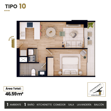 Flats de 1 dorm desde 44 m2 hasta 46 m2.